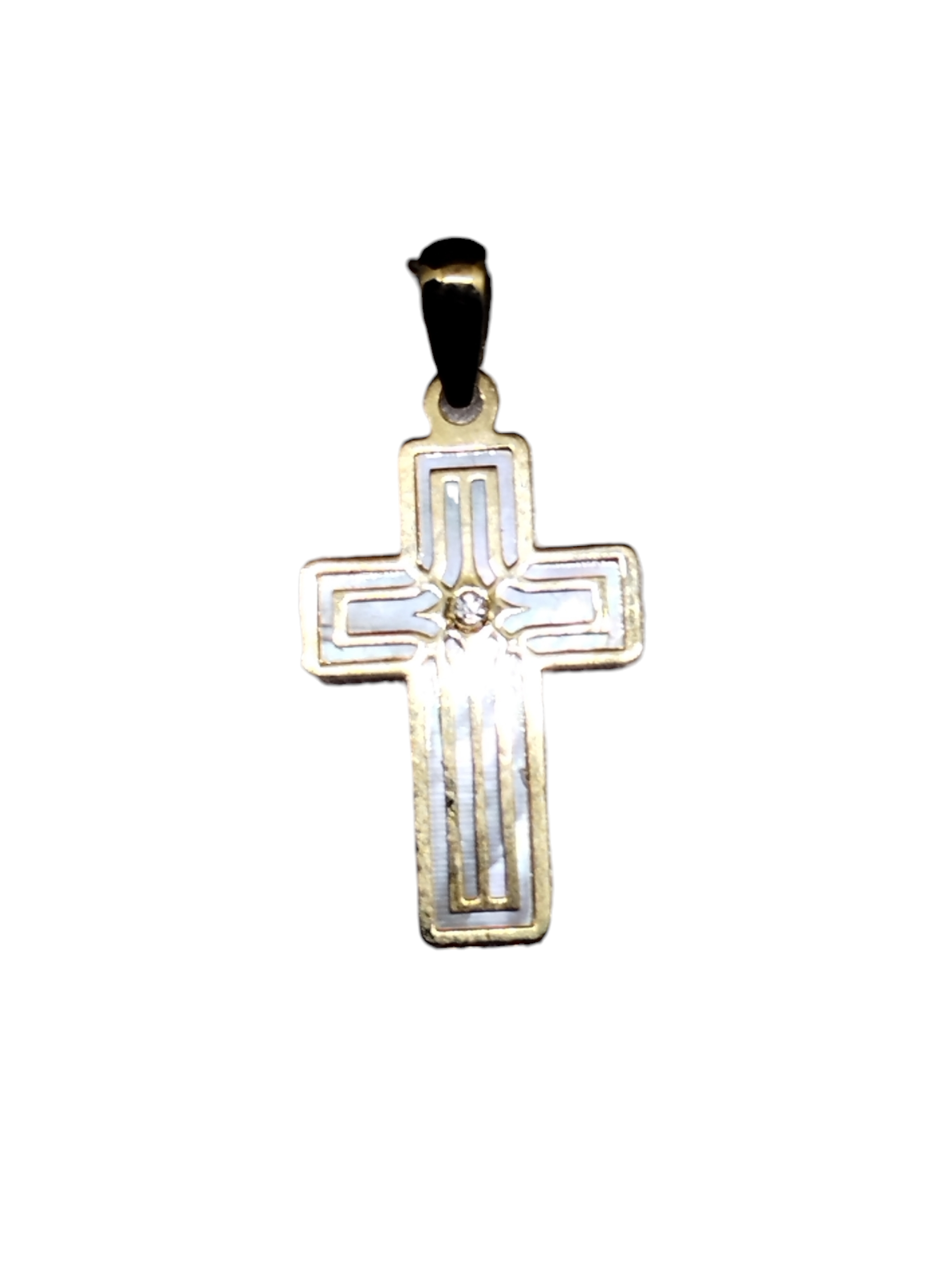 Cruz 18k, nácar con circonita en medio.